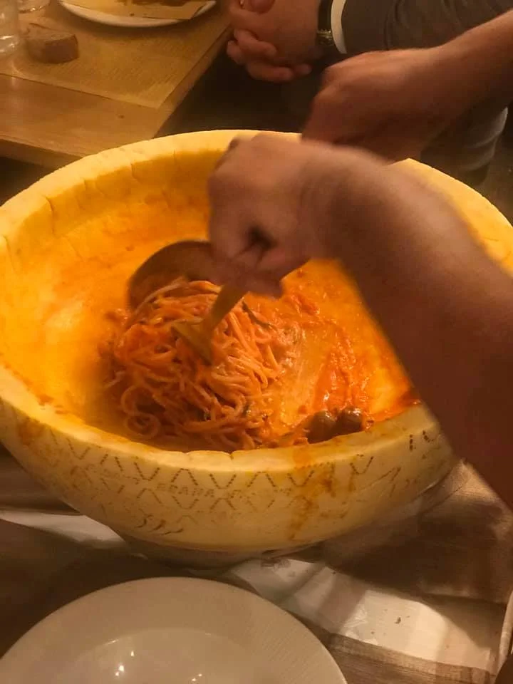 Their house speciality is to cook the pasta inside of a huge, black round of cheese...yes cheese. They set it on fire. It’s so good, it’s to live for!! AND yes, there are pitchers of wine involved as well. Does it get any better then this??