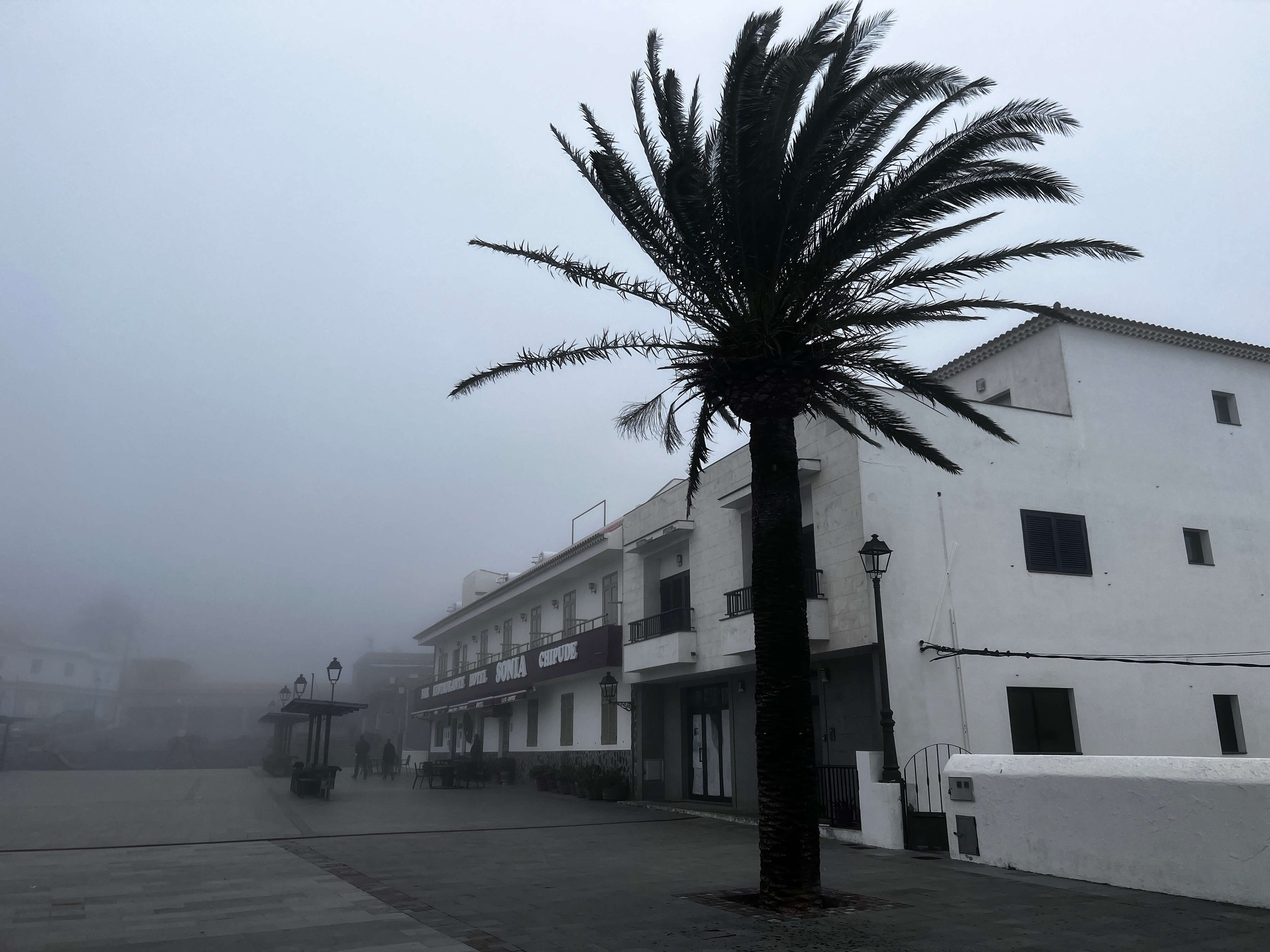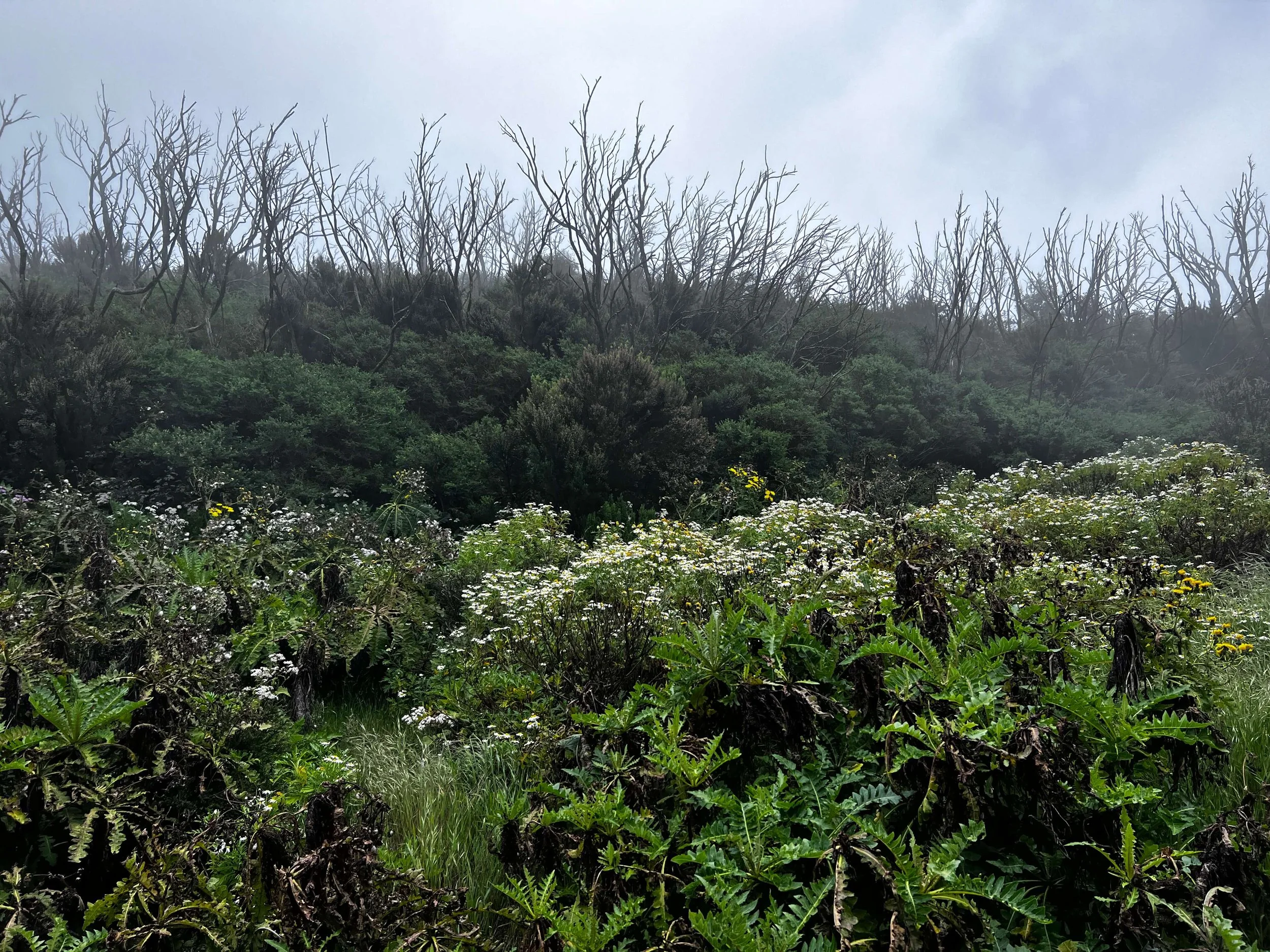 The hike quickly started climbing up and stayed steadily going up for the better part of 3 hours until I reached the highest point of the island, Alto de Garajonay, at 1487m/4,879ft. From here you can have a 360 view of four other Canary Islands: El Hierro, La Palma, Tenerife and Gran Canaria…or so I’m told. I had a 360 view of the deep void shrouded in fog and wind.